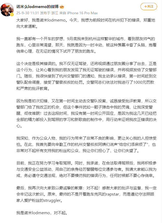 就此前无证驾驶事件道歉