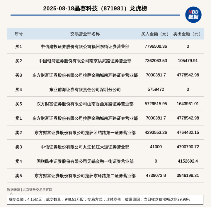 每经讯配资官网,2025年8月18日,北交所上市公司晶赛科技(871981,收盘价:46.56元)登上龙虎榜,交易方式是连续竞价,披露原因是当日收盘价涨幅达到29.98%,成交数量948.51万股,成交金额4.15亿元。买一席位为中信建投证券股份有限公司福州东街证券营业部,买入779.65万元;卖一席位为东方财富证券股份有限公司拉萨金融城南环路证券营业部,卖出477.85万元。